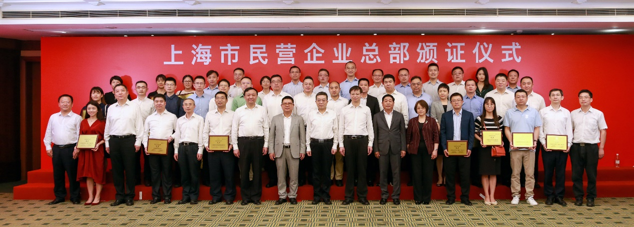 "Group photo of Du Junhong, chairman of Longcheer, and representatives of the first batch of headquarters of private enterprises in Shanghai"